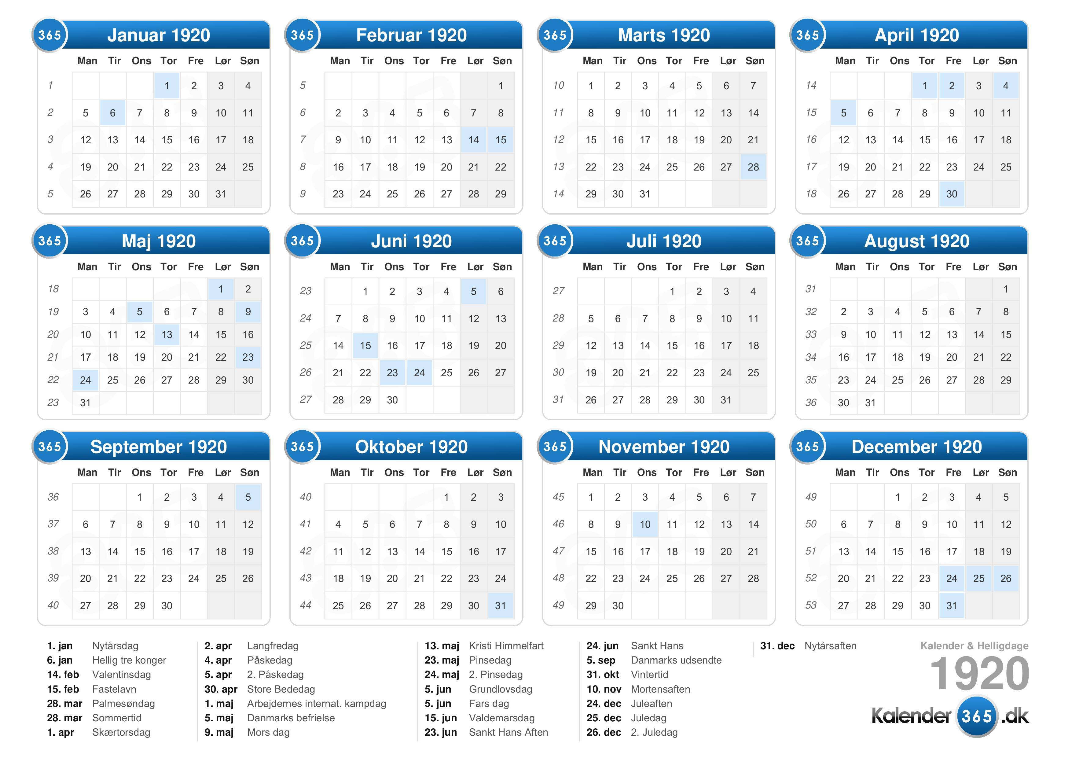 Download Kalender 1920 med helligdage. (Liggende format - 1 Side)