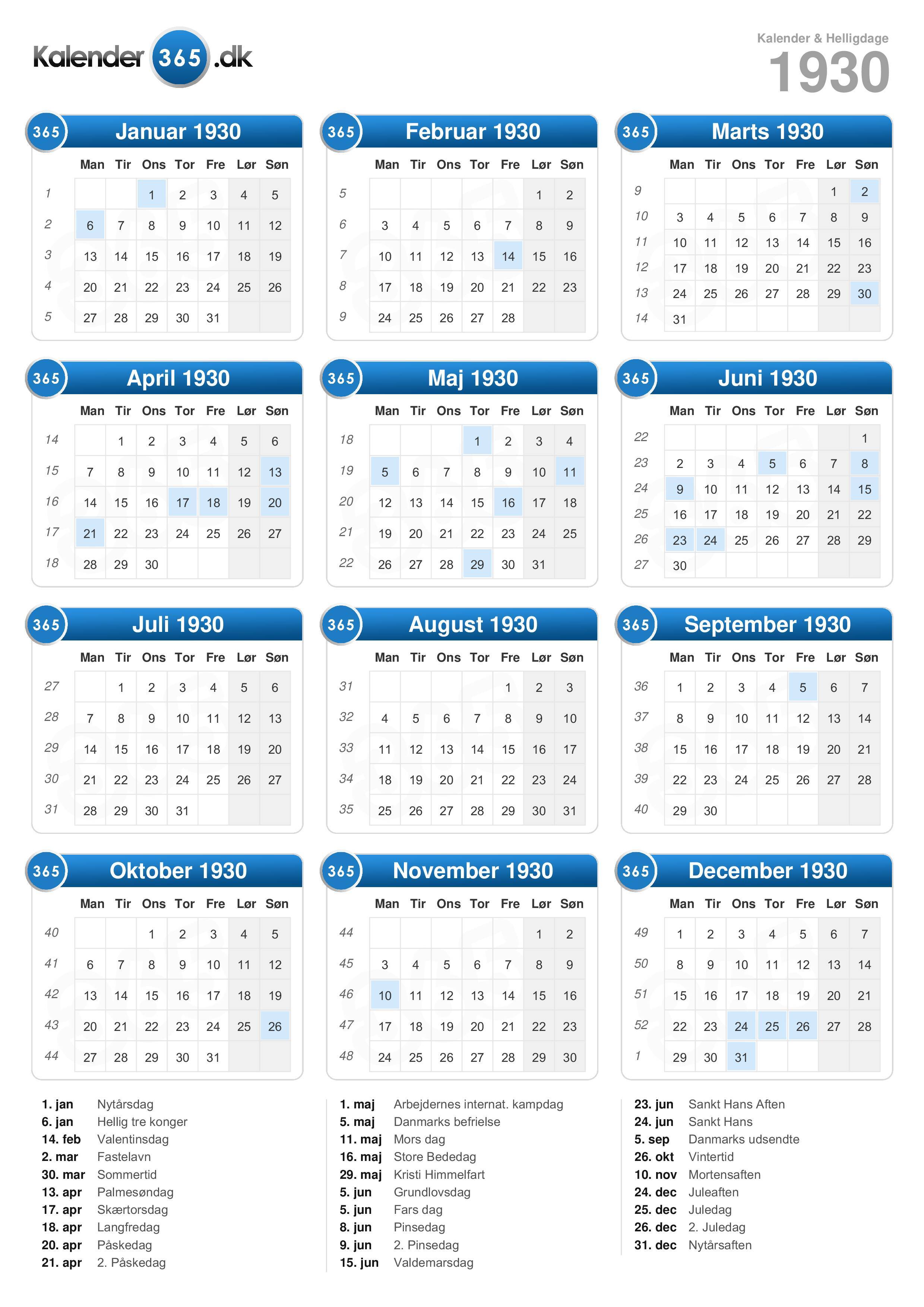 Download Kalender 1930 med helligdage. (Liggende format - 1 Side)