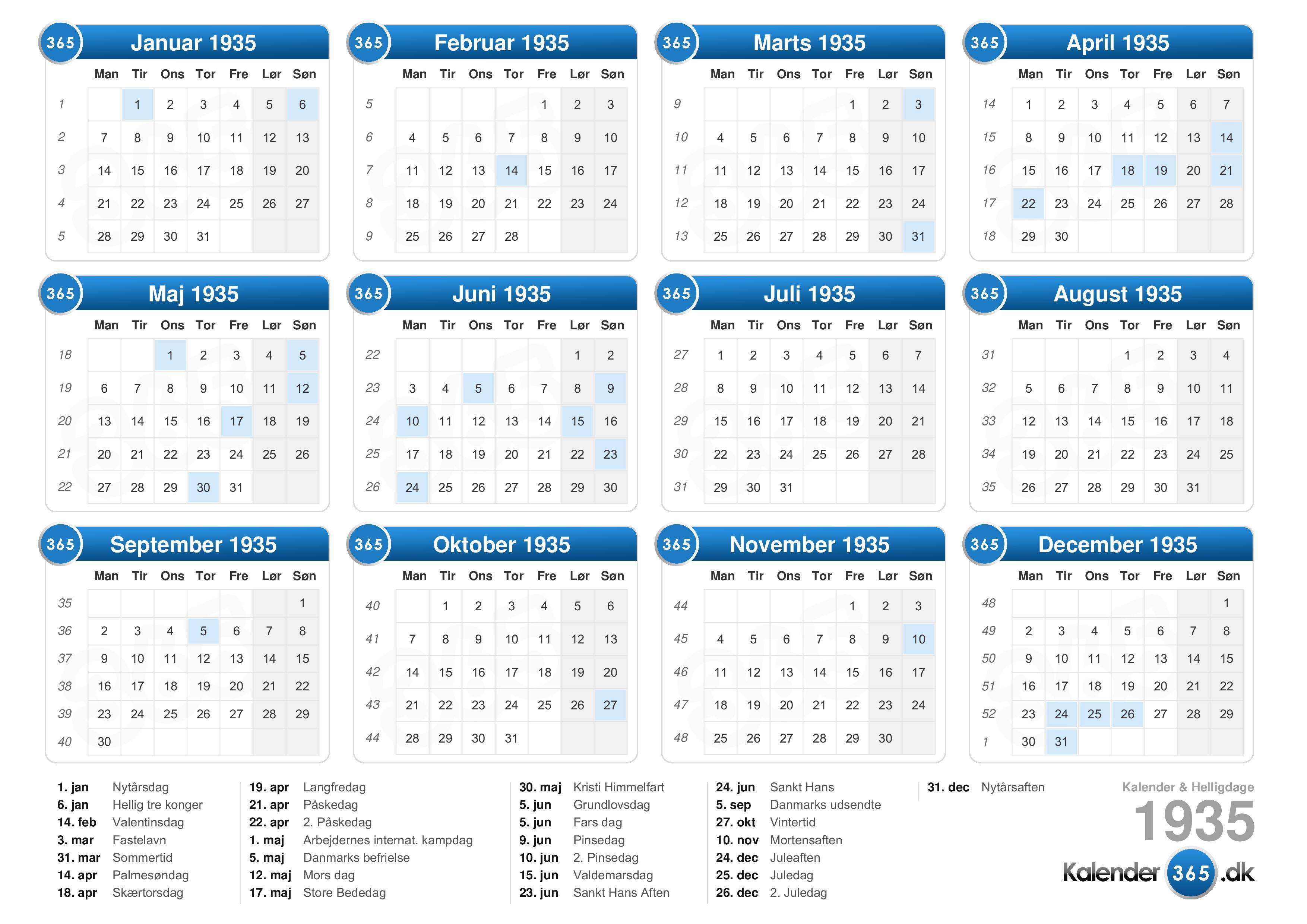 Download Kalender 1935 med helligdage. (Liggende format - 1 Side)