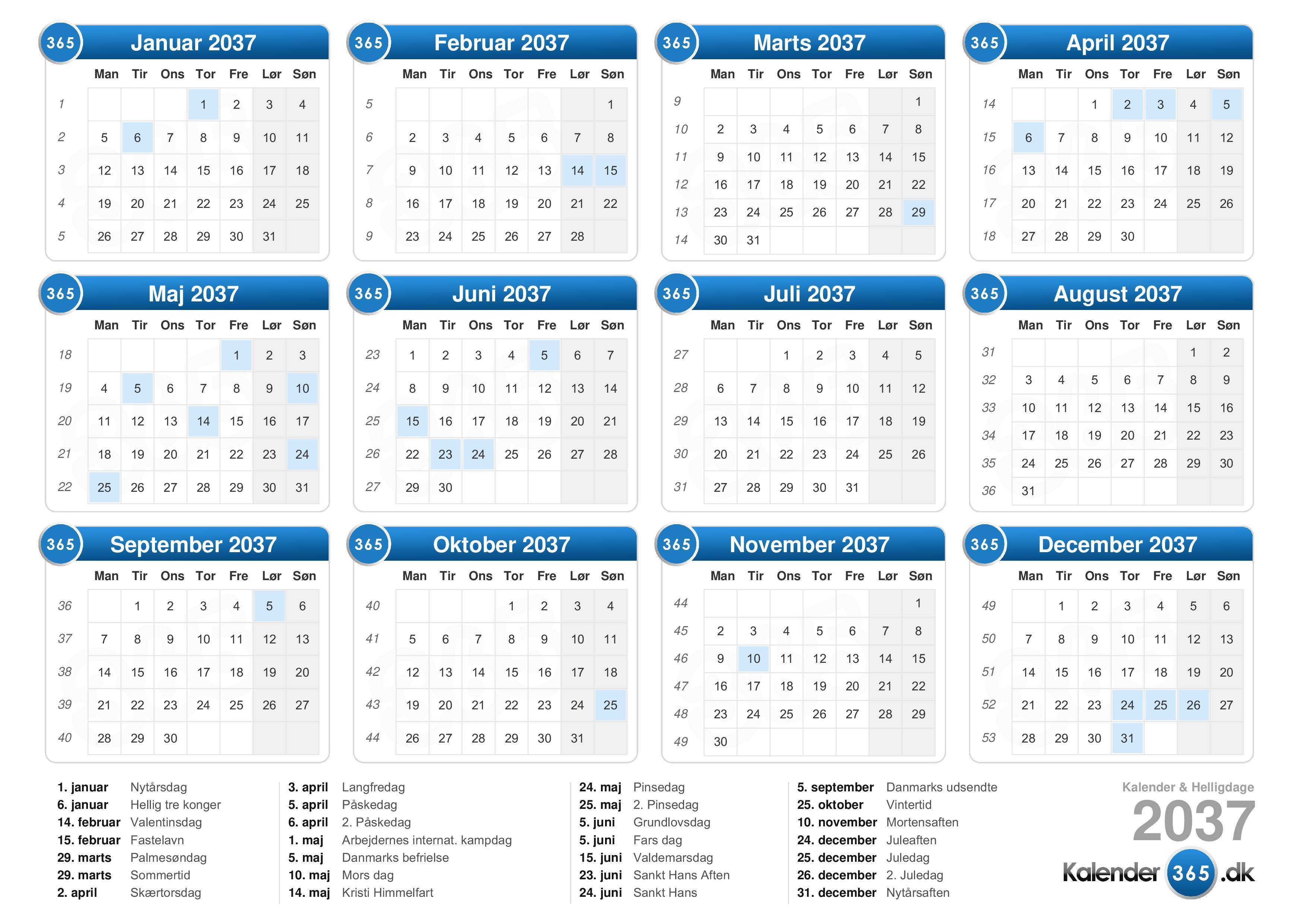 Download Månedskalender 2037 med helligdage. (Liggende format - 12 Sider)