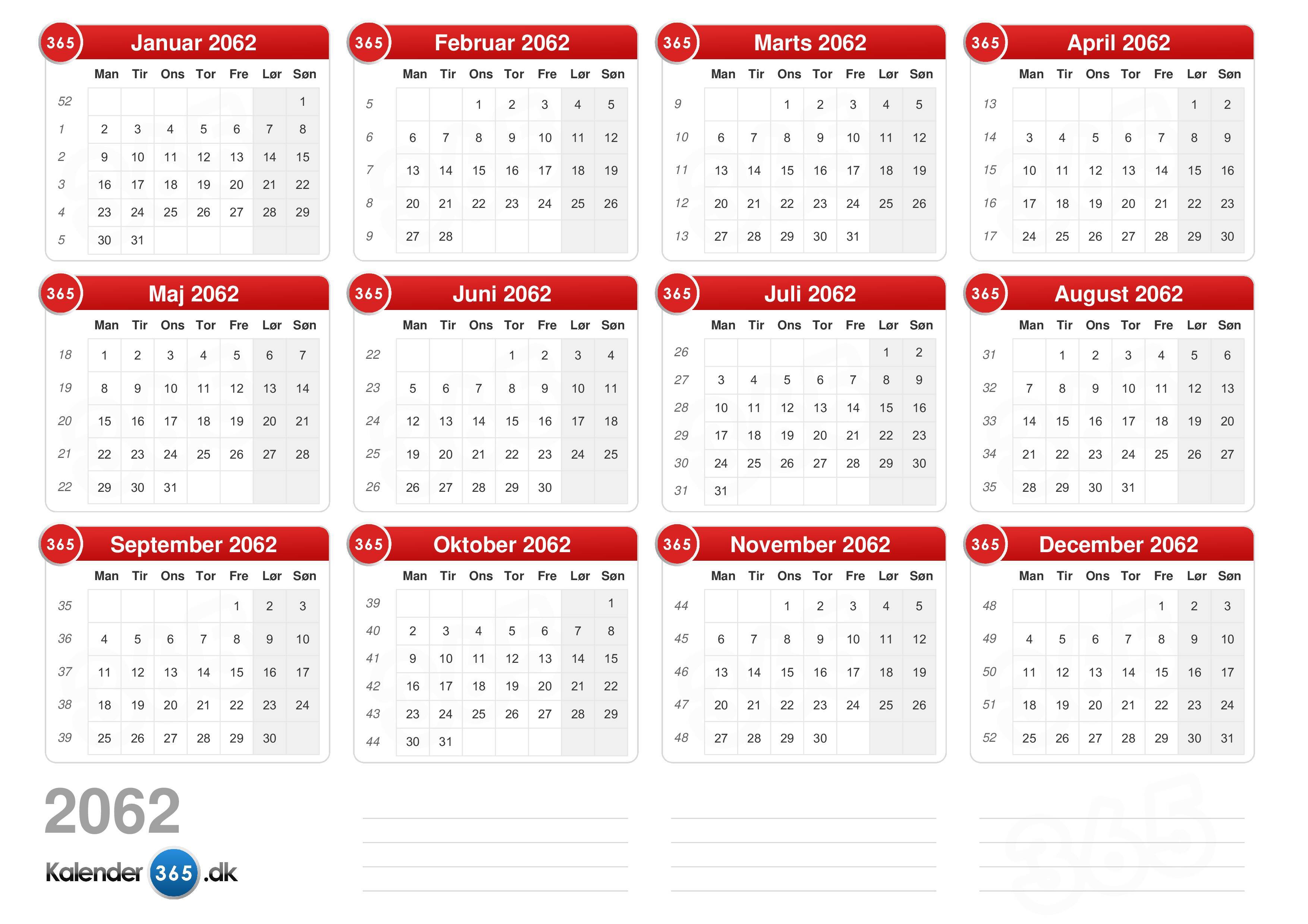 Download Månedskalender 2062 med helligdage. (Liggende format - 12 Sider)
