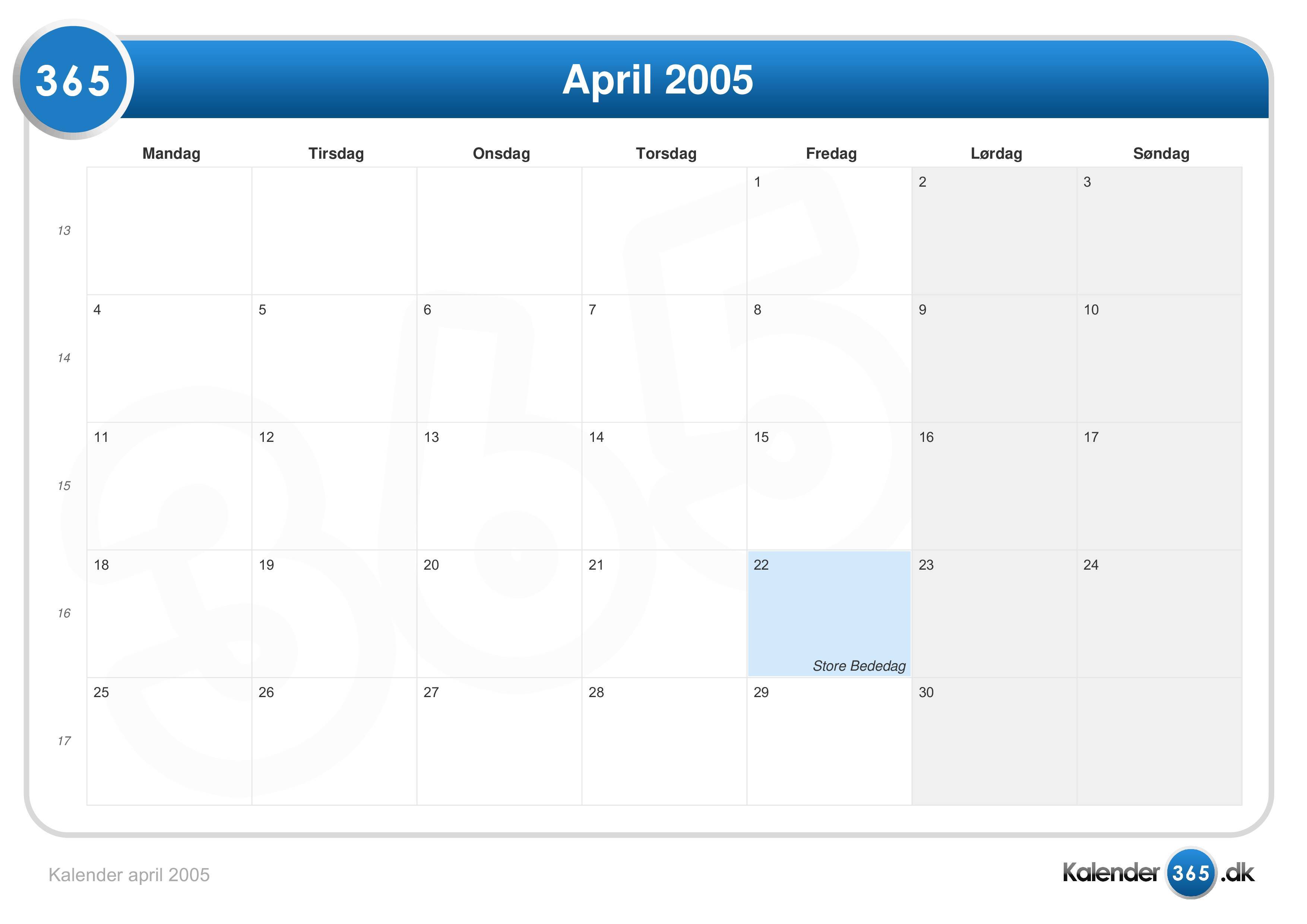 Med denne april 2005 kalender kan du hurtigt se, hvornår du fx har ferie.