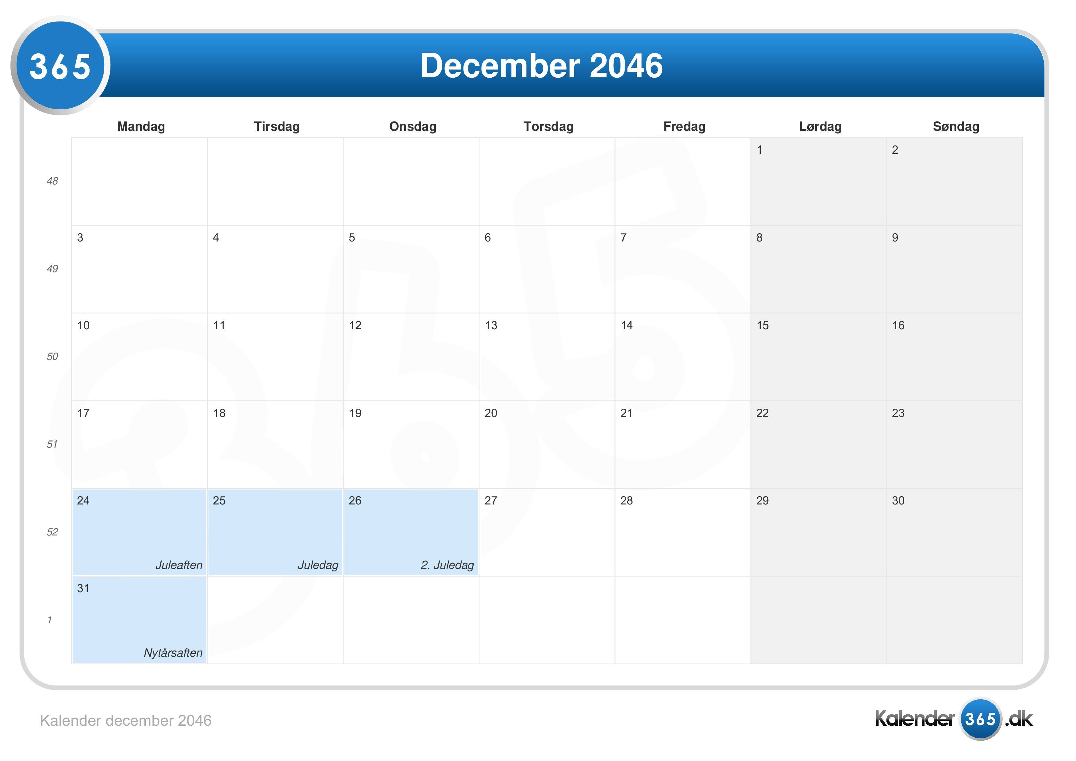 Med denne december 2046 kalender kan du hurtigt se, hvornår du fx har ferie.