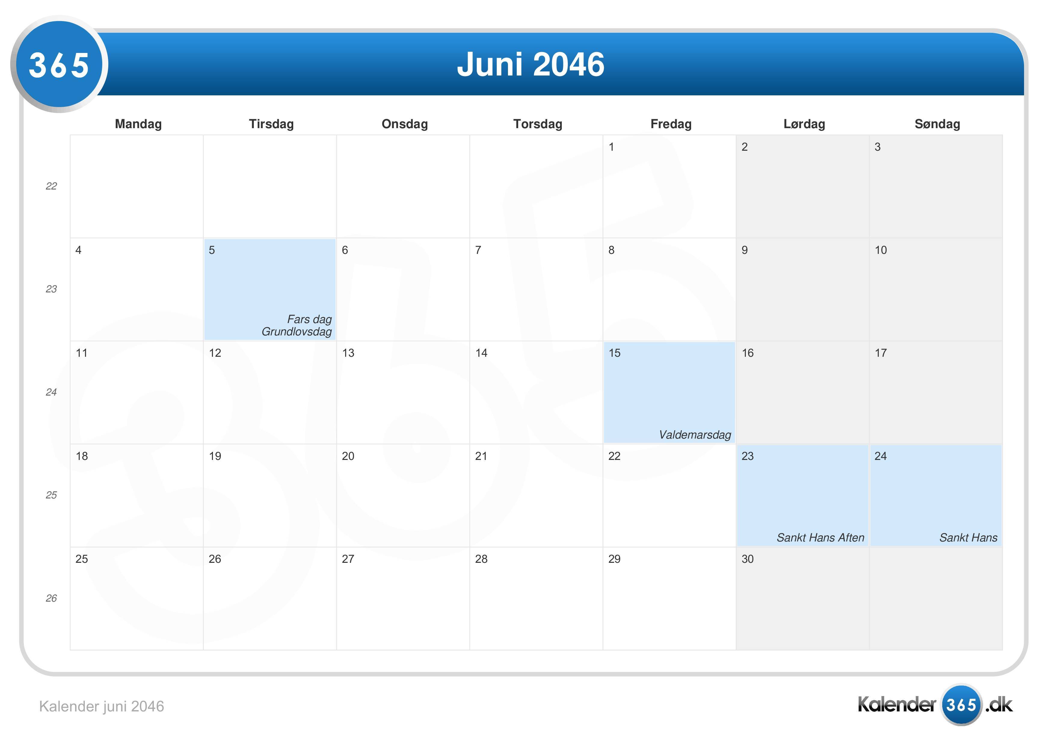 Med denne juni 2046 kalender kan du hurtigt se, hvornår du fx har ferie.