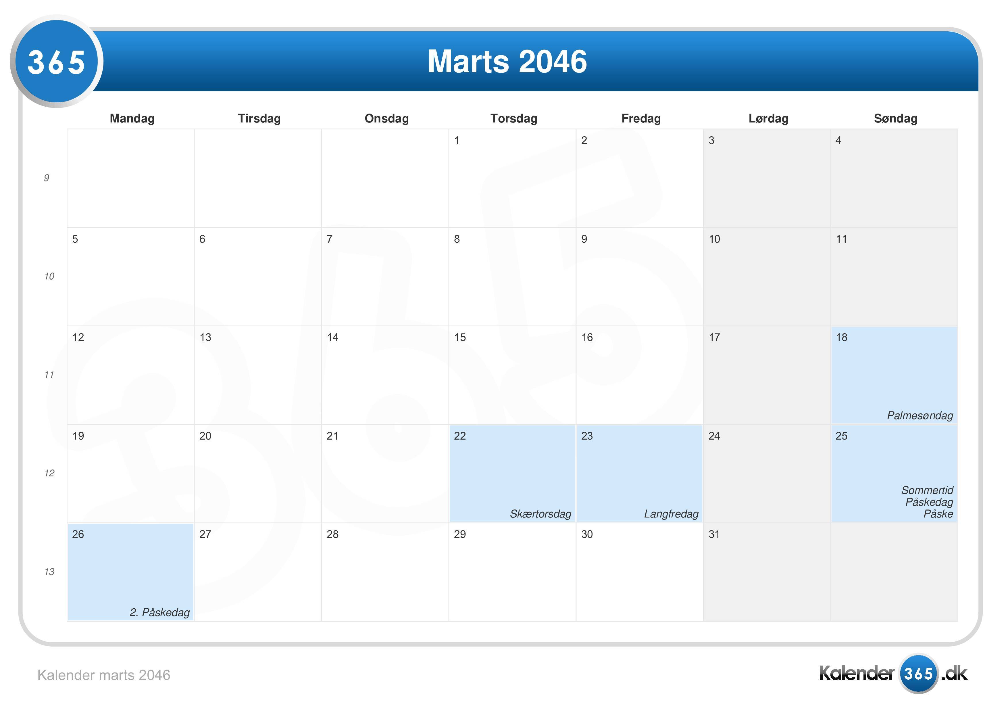 Kalender marts 2046