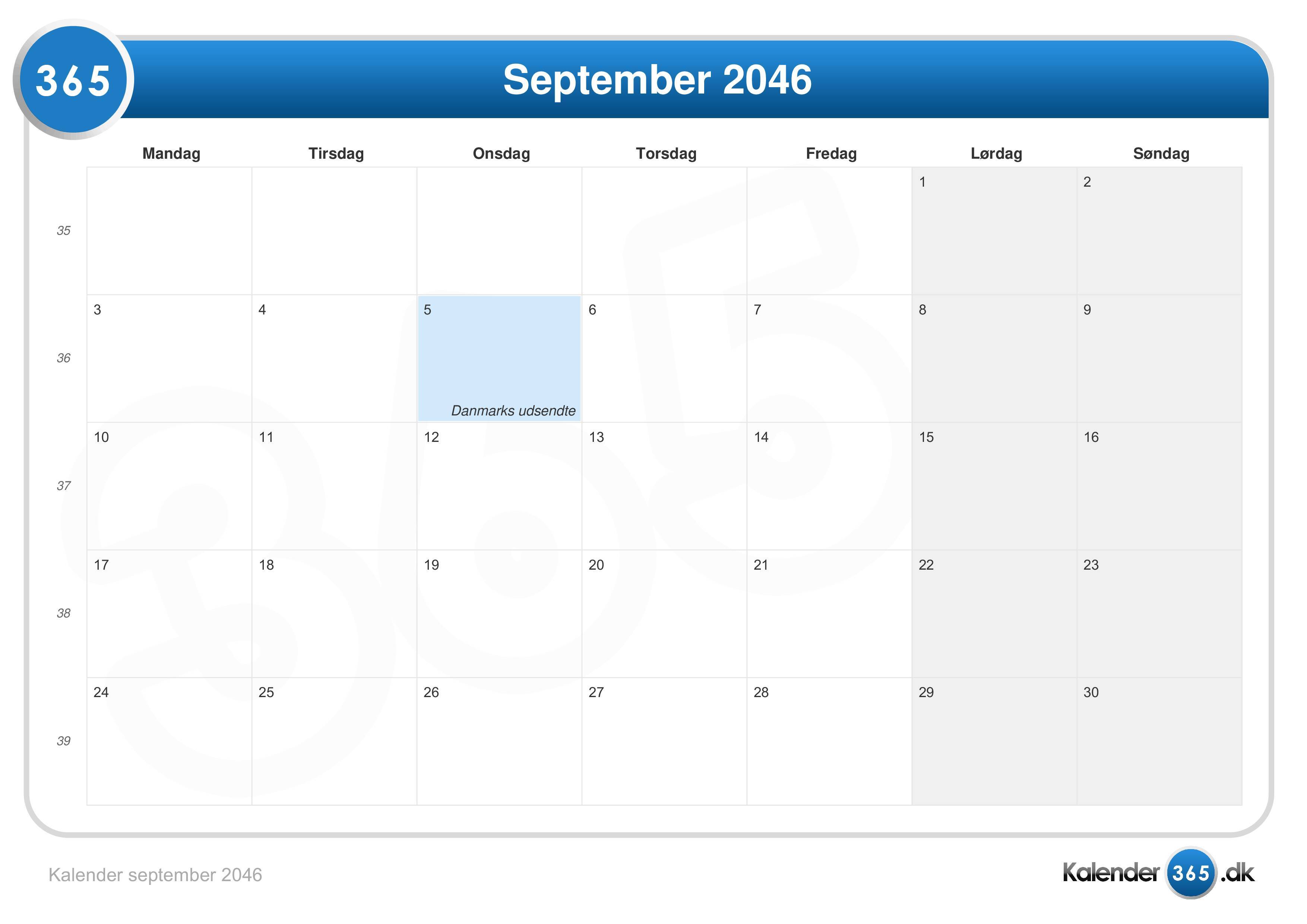 Med denne september 2046 kalender kan du hurtigt se, hvornår du fx har ferie.